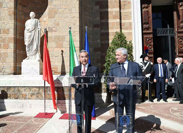 王毅表示,中意两国作为东西方文明的代表,为人类社会的发展进步作出过巨大贡献。当前国际形势复杂动荡、危机四伏,但也危中有机,中意应总结弘扬迄今交往的成功经验,为国际关系发展提供有益借鉴。近期习近平主席提出全球治理倡议,宣布应对气候变化新一轮国家自主贡献目标,体现了中国胸怀天下、立己达人的负责任大国担当,展示了对多边主义的坚守和对联合国的支持。中方愿同意方一道,继续做维护和平、稳定、发展、繁荣的建设性力量,推动国际社会团结应对全球性挑战,构建更加公正合理的全球治理体系,携手迈向人类命运共同体。